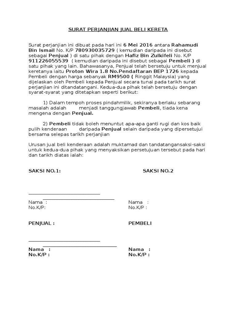 Pdf Surat Perjanjian Jual Beli Kereta Kaedah Sambung Bayar Zafirah Che Ariff Academia Salam Tey Academia Edu from 0.academia-photos.com Perkhidmatan jual beli kereta baru dan terpakai, menguruskan sambung bayar kereta, menguruskan pinjaman kereta, jual kereta untuk spare part,menguruskan insuran pemotoran, memberi perkhidmatan berkaitan dengan jpj. Ya, hal ini dilakukan demi kelancaran transaksi supaya dijauhkan dari. Dengan demikian tidak ada yang bisa melanggar aturan yang sudah dibuat oleh kedua belah pihak dalam hal jual beli. Hal ini dilakukan agar jika terjadi suatu permasalahan yang tak terduga. Yuk, pahami dan praktikkan agar segala transaksi berjalan lancar! (tuliskan perkataan juga) akan dihangus sekiranya pihak kedua memungkiri janji yang telah dibuat. Kami menyediakan perkhidmatan jual beli kereta sambung bayar. 71%(21)71% found this document useful (21 votes).